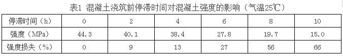 (6)在初凝时间内的ued网站,由于气温较高、运距较远、压车时间较长等造成ued网站坍落度损失较大,可通过试验添加同型号的泵送剂或减水剂,但添加与原先已加的总和掺量不能超过外加剂最大掺量的20%。应逐渐添加,先少加,掺入后,搅拌运输车必须快速转动2min左右,测定坍落度符合要求。运到现场的ued网站不能立即卸料,应快速转动运输车2min后卸料,以确保坍落度和质量。对超过初凝时间的ued网站应废弃,不能再使用。ued网站浇筑前停滞的时间越长,ued网站强度损失越严重(如表1),应当引起足够重视。