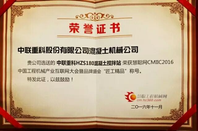 中联重科HZSE180/HZS180产品4.0搅拌站荣获CMIIC2016中国工程机械产业互联网大会“匠工精品”称号,这标志着中联重科4.0搅拌站产品得到了行业的充分认可。