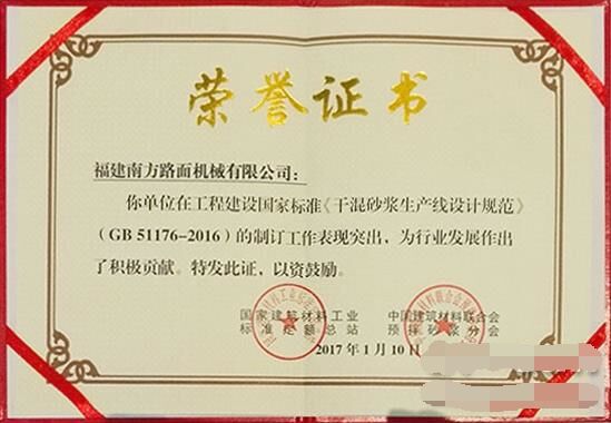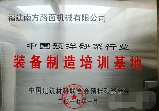 2017年1月10日,在2017'首届中国国际预拌砂浆装备技术研讨会暨预拌砂浆绿色生产装备及机械化施工技术峰会上,福建南方路面机械有限公司被中国建材联合会预拌砂浆分会授予“中国预拌砂浆行业装备制造培训基地”;同时,因在国家标准GB51176-2016《干混砂浆生产线设计规范》编制工作中的特殊贡献,被授予“特别贡献单位”。