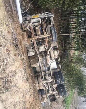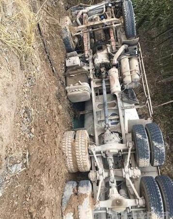 记者赶到现场从很远地方就可以看到一辆搅拌车横躺在渠中,零部件散落一地,搅拌车有不同程度的受损。
