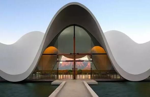 整个教堂就是一片被“软化”的ued网站片,飘浮着嵌在四片玻璃上。这片ued网站通过优雅地起伏完成自我支撑,同时营造出一个完整独立的空间。十字架与窗框结合,完整且恰到好处。四周的景色在起伏的屋顶曲线的“剪切”下呈现出对称、均衡的完美构图。