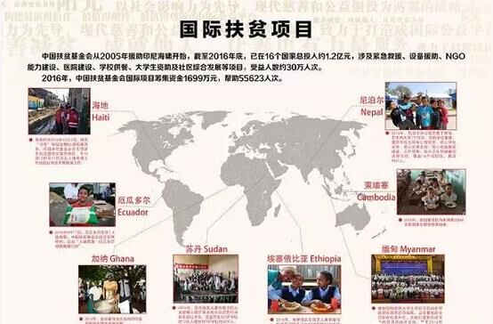 从2005年援助印尼海啸开始,截至2016年底,中国扶贫基金会已在17个国家或地区总投入约1.12亿元,涉及紧急救援、设备援助、NGO能力建设、医院建设、学校供餐、大学生资助及社区综合发展等项目,受益人数约30万人次。2016年,我会国际项目筹集资金1699万元,帮助55623人次。