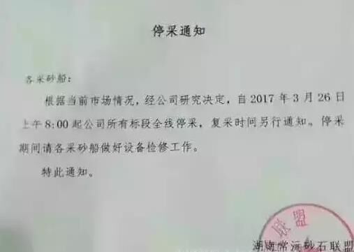 湖南常沅砂石联盟近日发布停采通知,自2017年3月26日上午8:00起,该公司所有标段全线停采砂石,复采时间待定。这停采了,砂石供应可咋办呢?
