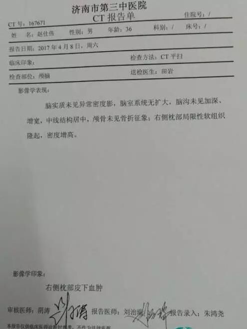 济南市第三中医院CT报告单显示,赵先生右侧枕部局限性软组织隆起,密度增高。赵先生的同事周先生对记者说:“看著朋友被打成这样,我心里很过意不去,所以我现在到医院照顾他。”