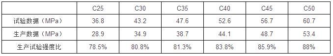 注:试验数据为三个月内6次配合比试验强度的算术平均值;生产数据为同配比连续生产三个月留置标准试件抗压强度的算术平均值。