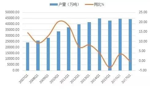 根据国家统计局数据,2017年一季度全国水泥总产量达44115万吨,同比下滑0.3%,这次与2015年是近十年以来唯一的两次负增长,尽管跌幅微弱,但同样值得重视。