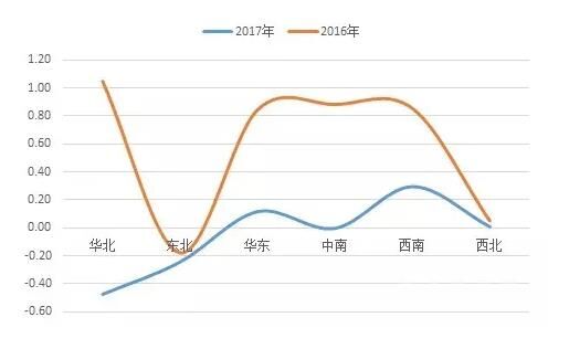 图2:2016、2017年六大区域对全国水泥产量增速贡献的百分点