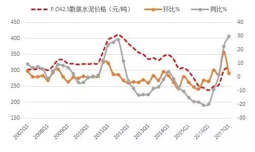 一季度,全国P.O42.5散装水泥平均价格为309.5元/吨,环比上涨2.88%,已连续四个季度呈上涨走势,上涨连续性近十年罕见,且同比涨幅高达30%,创近十年新高,高于2011年一季度23.6%的水平。
