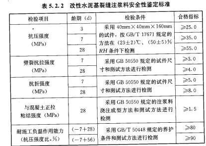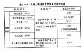 对于裂缝修补材料来说,其材料的安全性能指标,必须符合GB50728-2011《工程结构加固材料安全性鉴定技术规范》的规定: