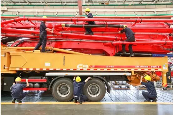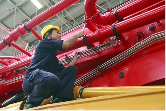 由于泵车生产线是高度柔性化的生产,产品型号有37米、49米、56米、66米、86米等几十种型号,还要满足客户的各种定制化需求,这就要求工人们在熟练掌握每一款产品的标准化作业同时,牢记每一颗螺母、每一根胶管、每一个阀块的正确安装方法,对泵车制造工艺做到了然于心,用最快的速度保证每一台泵车的顺利下线。