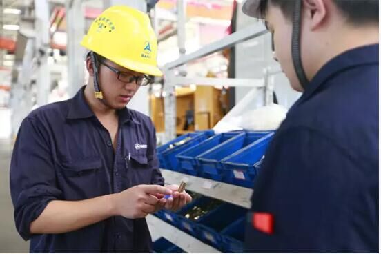 奉俊翔今年刚满28岁,别看年纪不大,却是一个地地道道的三一“老人”,入司八年以来,奉俊翔已经带出了8名徒弟。如奉俊翔这样的“80后”技术骨干在泵车装配班还有很多,他们已成为技术培训和传承“精益制造”的中坚力量。每天早会后,老员工们会将新人聚在一起,为新人工作中遇到的问题答疑解惑。这种“师带徒”制度促进了年轻工人的成长,也加快了企业发展。
