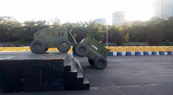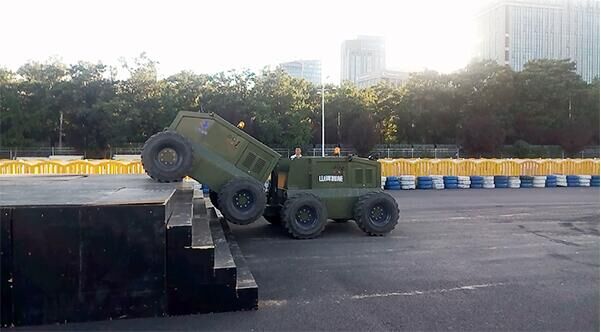 在翻越障碍物的过程中,车体姿态灵活变化,轻松攀越高台,现场惊叹与掌声不断。