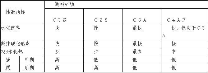 硅酸盐水泥熟料的矿物组成,是影响水泥凝结硬化的主要因素,四种熟料矿物的水化、凝结硬化特性见表2—1所示。