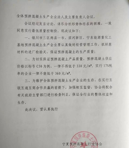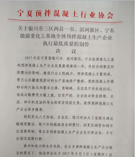 面对如此大的生存危机,宁夏ued网站协会于9月7日召开了银川市三区两县一市、滨河新区、宁东能源重化工基地全体预拌ued网站生产企业法人及主要负责人会议。会议一致同意实行最低质量控制价。预拌ued网站供应价格以标号C30为例,一律不得低于330元/方,实行17%税率的企业一律不能低于360元/方,以切实保证当地预拌ued网站质量。