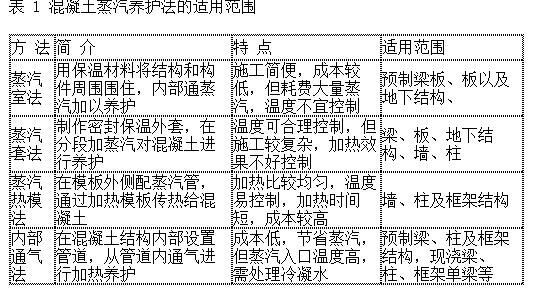 蒸汽法养护按照不同的加热方式可以分为蒸汽室法、蒸汽套法、毛管模板法、蒸汽热模法和内部通气法,其特点及使用的范围见表 1。