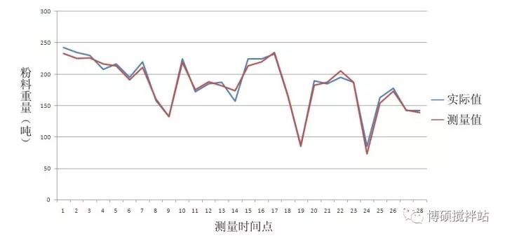 输出重量信息,测量结果准确,避免了温度、压力、粉尘、架桥、塌陷等环境因素的影响。以下图示为一定时间段内(两个月),粉料重量的实际值与测量值之间的对比曲线。