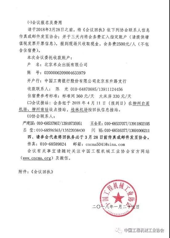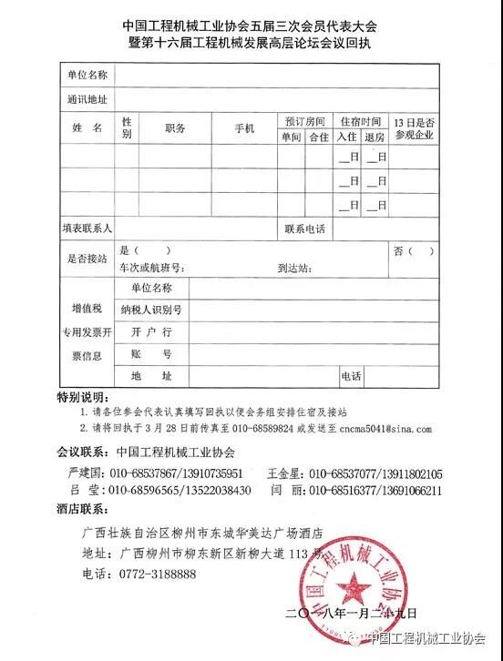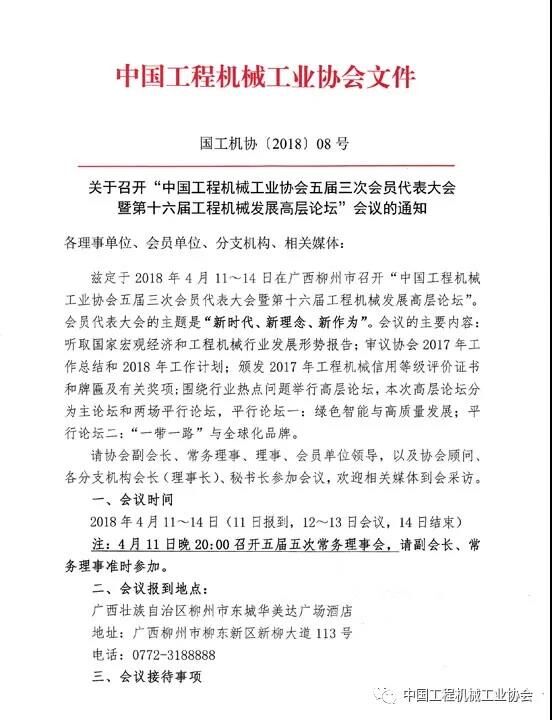 中国工程机械工业协会兹定于2018年4月11~14日在广西柳州市召开“中国工程机械工业协会五届三次会员代表大会暨第十六届工程机械发展高层论坛”。会员代表大会的主题是“新时代、新理念、新作为”。