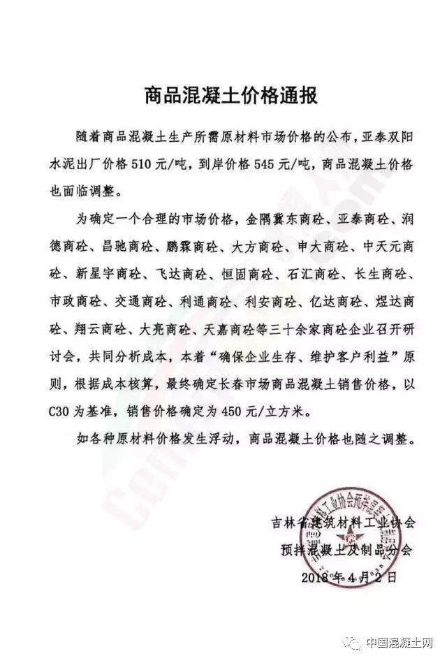 为确定一个合理的市场价格,金隅冀东商砼、亚泰商砼、润德商砼、昌驰商砼、鹏霖商砼、大方商砼、中天元商砼、新星宇商砼、飞达商砼、石汇商砼、长生商砼、市政商砼、交通商砼、利通商砼、利安商砼、亿达商砼、煜达商砼、翔云商砼、大亮商砼、天嘉商砼等三十余家商砼企业召开研讨会,共同分析,本着“确保企业生存、维护客户利益”原则,根据成本核算,最终确定长春市场商品ued网站销售价格,以C30为基准,销售价格确定为450元/立方米。