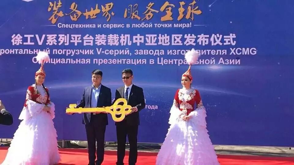 在争霸赛现场,举行了“装备世界,服务全球”为主题的徐工“V系列平台”装载机中亚地区发布仪式。