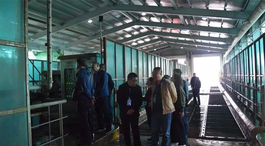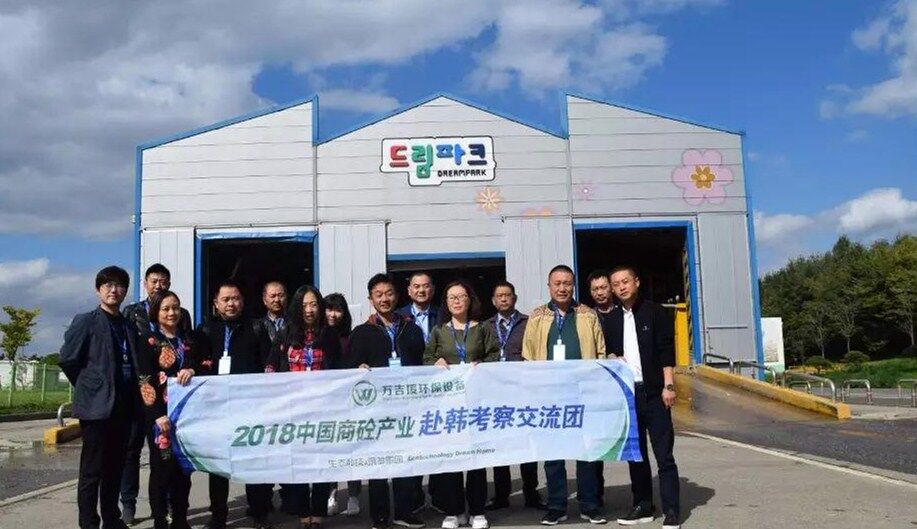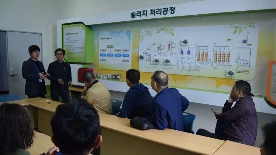 10日下午考察团一行到达韩国最大的垃圾填埋厂,首先参观生活食品垃圾运输车辆冲洗设备,此套设备由两组车辆冲洗线构成,每条线长度为50米,当车辆驶入至感应区设备自动启动对车辆全方位立体式冲洗,冲洗中掉落的异物经特制排泥装置送至中央皮带输送机。车辆完成冲洗后驶出前对车身喷淋消毒去异味药剂,最后烘干后离开。每日完成一千车次的清洗消毒工作。