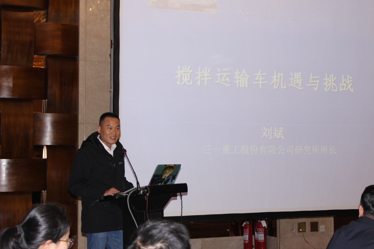 三一重工股份有限公司研究所所长刘斌先生作了《搅拌运输车机遇与挑战》的主题报告,从搅拌车面临的五大机遇和三大挑战分析,提出搅拌车的研发与生产要回归本质,即运输和质量,保证安全运输、环保运输、合标运输、保证运输的ued网站质量。