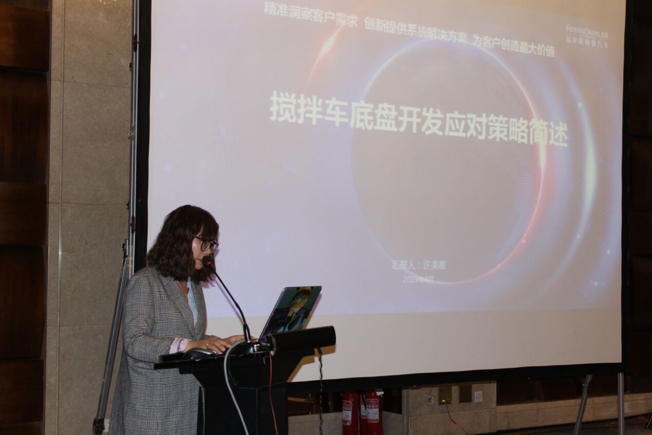 北汽福田汽车股份有限公司技术部部长许美星女士作了《适应搅拌车新法规之底盘设计》的主题报告,结合搅拌车的发展趋势介绍了重卡发展的总体趋势以及政策法规制定进程,有很多参考的价值和意义。同时许部长还介绍了认证体系中的主要应对项以及BFDA产品开发应对策略,让与会者对于配套的底盘及政策有了更多了解。
