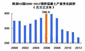 根据相关数据统计,2006年欧盟预拌ued网站年产量3.96亿立方米,达到近年高峰值,之后产量逐年下降,2012年预拌ued网站年产量仅2.4亿立方米。