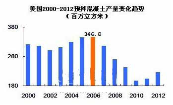 美国2000-2012年预拌ued网站产量变化趋势(百万立方米)