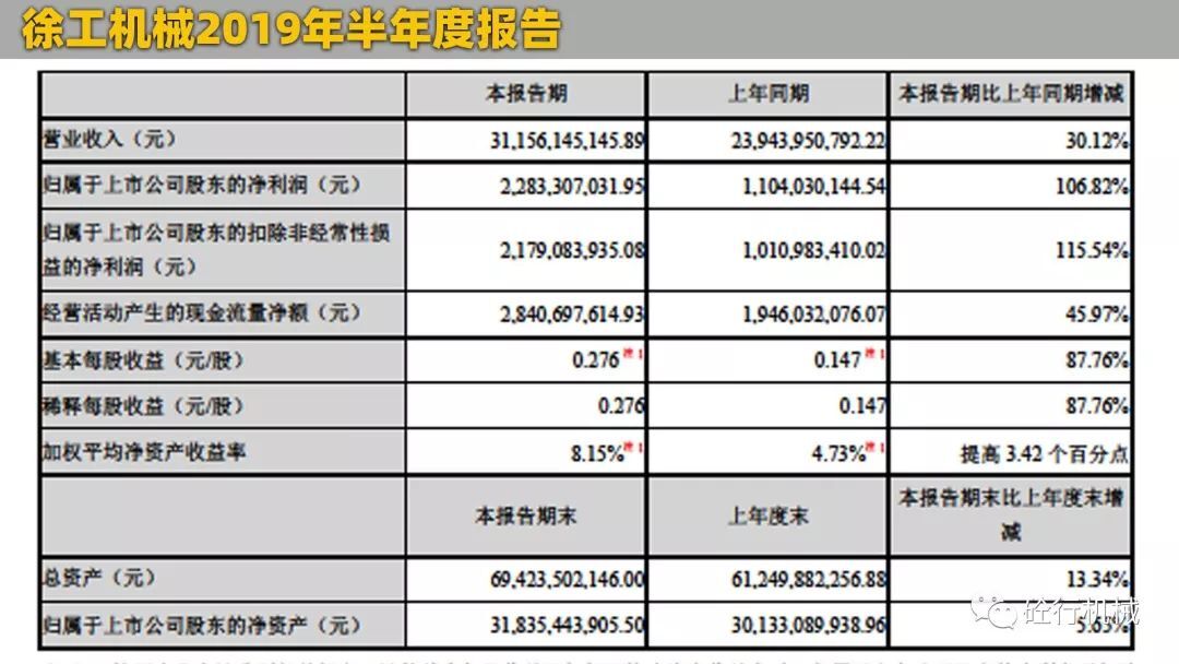 2019年上半年,徐工机械实现营业总收入311.56亿元,同比增长30.12%。其中包括海外收入44.48亿元,同比增长20.07%;归属于上市公司股东的净利润22.83亿元,同比增长106.82%。相比较2018年上半年,今年上半年徐工的成绩还是很喜人的,特别是在净利润这一块,比去年同期增加了一倍之多。