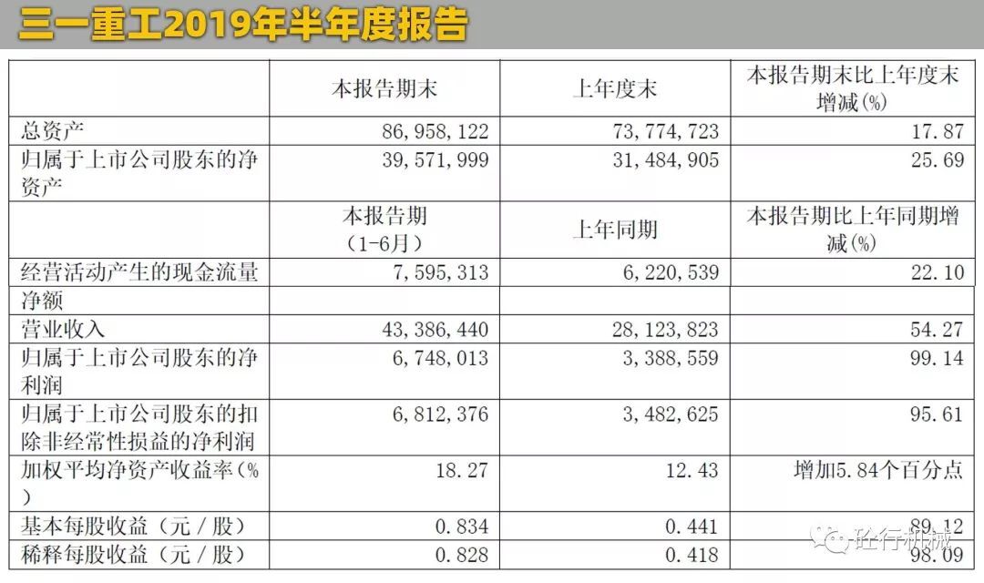 8月29日晚,三一重工官方发布了其2019年上半年业绩公告。上半年,公司实现营业总收入433.86亿元,同比增长54.27%;包括三一国际销售收入70.26亿元,同比增长15.34%。归属于上市公司股东的净利润67.48亿元,同比增长99.14%。对比之下,不管是营收能力,还是赚钱能力,三一重工都是最强的,净利润更是比徐工和中联净利润的总和还要多将近一倍,民营重工第一品牌当之无愧。