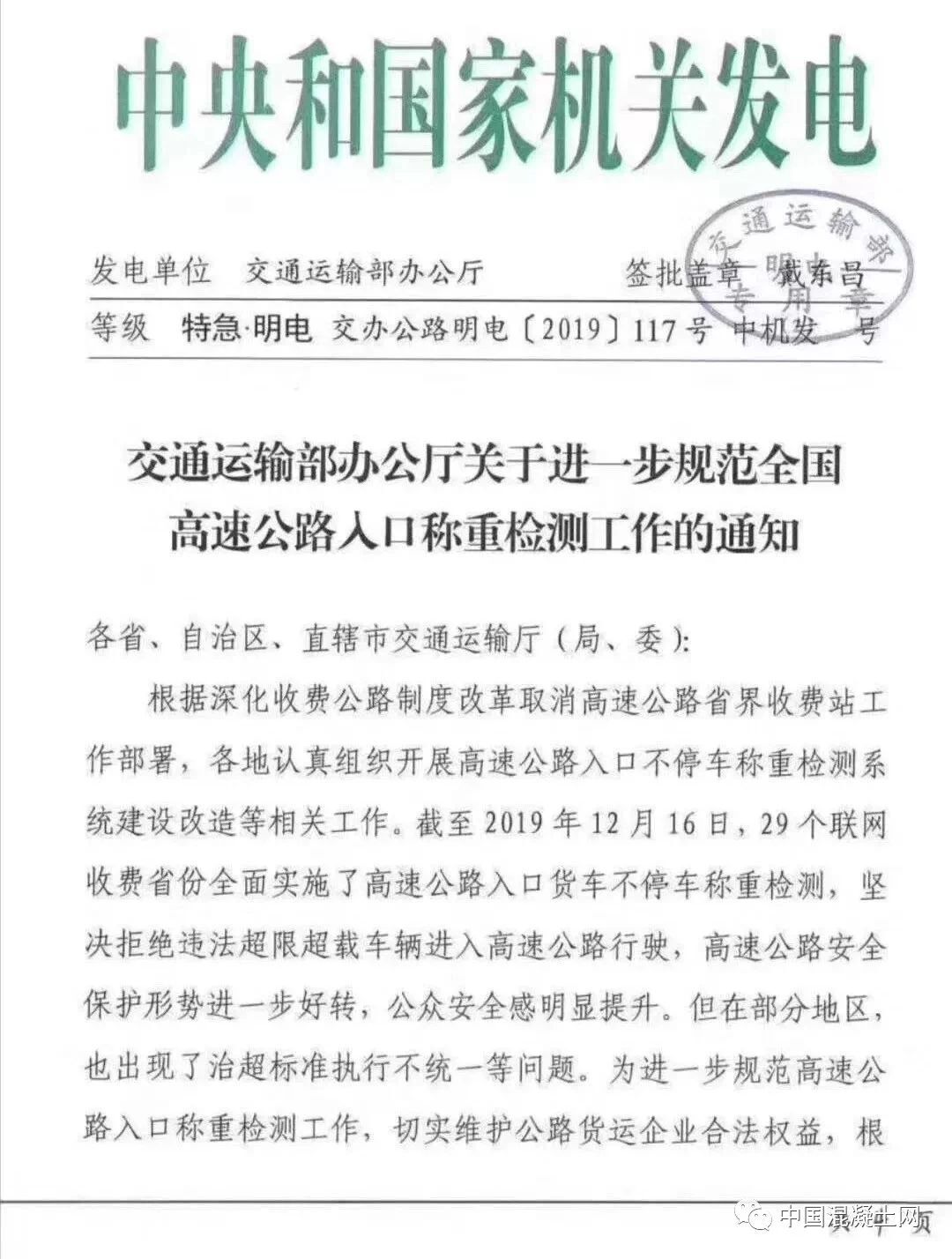 12月17日,交通运输部办公厅发布特急文件《关于进一步规范全国调整公路入口称重检测工作的通知》(交办公路明电【2019】117号)(以下简称“《通知》”)。《通知》直指全国部分地区治超标准不统一的问题。为进一步规范高速公路入口称重检测工作,切实维护公路货运企业合法权益,根据相关法律法规和规定,有关通知如下: