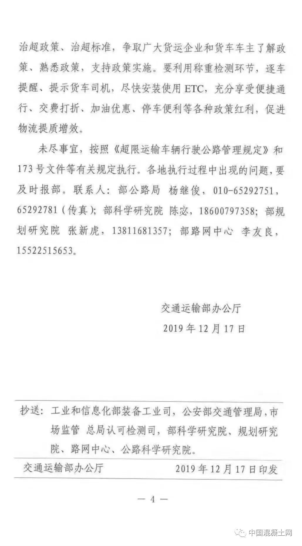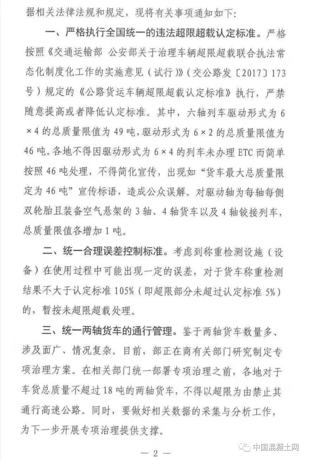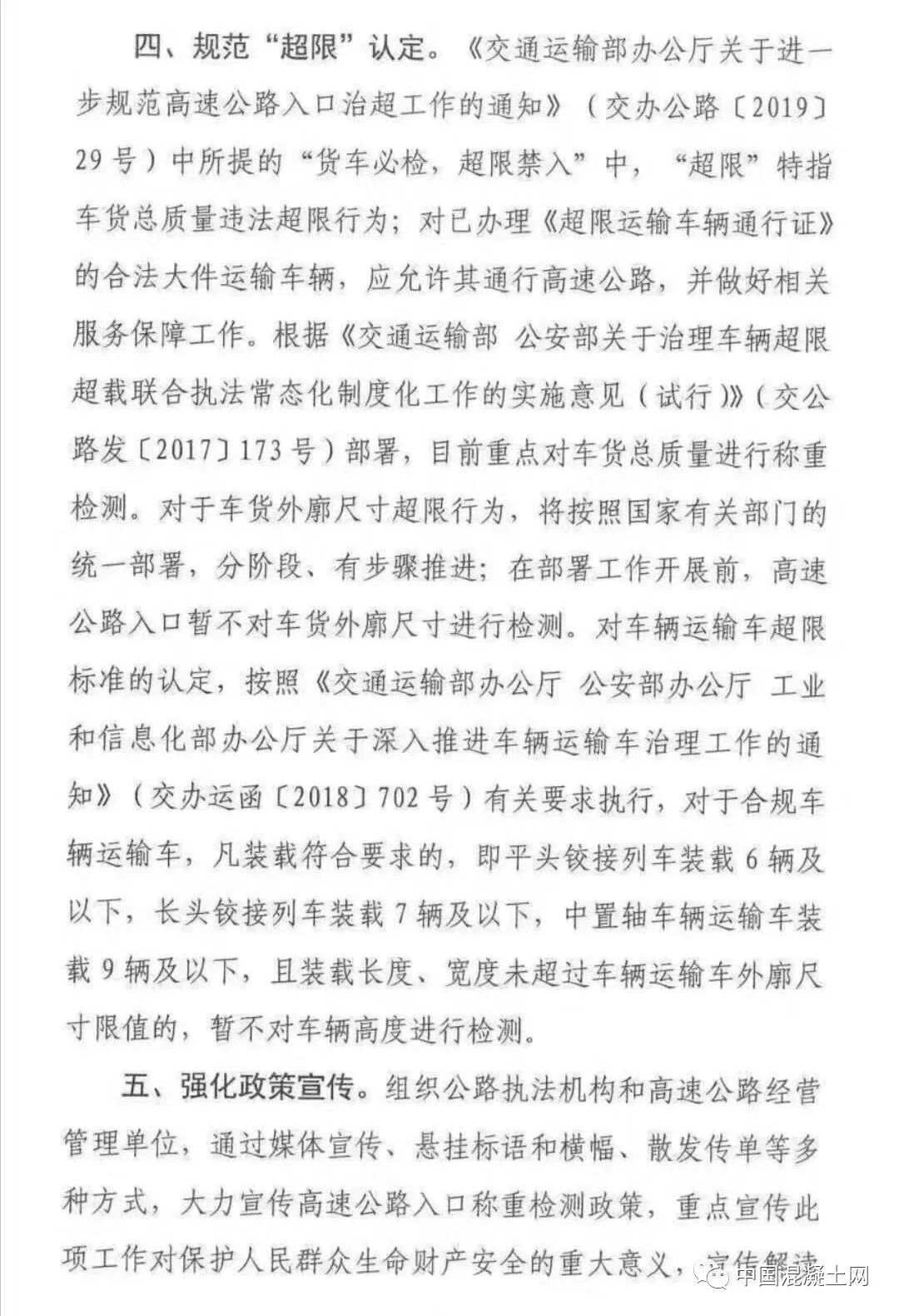严格按照《交通运输部 公安部关于治理车辆超限超开车联合执法常态化制度化工作的实施意见 (试行)》(交公路发【2017】173号)规定的《公路货运车辆超限超载认定标准》执行,严禁随意提高或者降低认定标准。其中,六轴列车驱动形式为6×4的总质量限值为49吨,驱动形式为6×2的总质量限值为46吨。各地不得因驱动形式为6×4人列车未办理ETC而简单按照46吨处理,不得简化宣传,出现如“货车最大总质量限定为46吨”宣传标语,造成公众误解。对驱动轴为每轴每则双轮胎且装备空气悬架的3轴、车轴货车以及4轴铰接列车总质量限值各增加1吨。考虑到称重检测设施(设备)在使用过程中可能出现一定的误差,对于货车称重检测结果不大于认定标准105%(即超限部分未直如过认定标准的5%)的,暂按未超限超载处理。鉴于两轴货车数量多、涉及面广、情况复杂。目前,部正在商有关部门研究制定专项治理方案。在相关部门统一部署专项治理之前,各地对于车货总质量不超过18吨的两轴货车,不得以超限为由禁止其通行高速公路。同时,要做好相关数据的采集与分析工作,为下一步开展专项治理提供支撑。《交通运输部办公室厅关于进一步规范高速公路入口治超工作的通知》(交办公路【2019】29号)中所提的“货车必检,超限禁入”中,“超限”特指车货总质量违法超限行为;对已办理《超限运输车辆通行证》的合法大件运输致车辆,应允许其通行高速公路,并做好相关服务保障工作。根据《交通运输部 公安部关于治理车辆超限超载联合执法常态化制度化工作的实施意见(试行)》(交公路发【2017】173号)部署,目前重点对车货总质量进行称重检测。对于车货外廓尺寸超限行为,将按照国家有关部门的统一部署,分阶段、有步骤推进;在部署工作开展前,高速公路入口暂不对车货外廓尺寸进行检测。对车辆运输超限标准的认定,按照《交通运输 部办公室厅 公安部办公室厅 工业和信息化部办公室厅关于深入推进车辆运输车治理工作的通知》(交办运【2018】702号)有关要求执行,对于合规车辆运输车,凡装载符合要求的,即平头铰接列车装载6辆及以下,长头铰接列车装载7辆及以下,中置轴车辆运输车装载9辆及以下,且装载长度、宽度未超过车辆运输车外廓尺寸限值的,暂不对车辆高度进行检测。组织公路执法机构和高速公路经营管理单位,通过媒体宣传、悬挂标语和横幅、散发传单等多种方式,大力宣传高速公路入口称重检测政策,重点宣传此项工作对保护 人民群众生命财产安全的重大意义 ,宣传解读治超政策、治超标准,争取广大货运企业和货车车主了解政策、熟悉政策,支持政策实施。要利用称重检测环节,逐车提醒、提示货车司机,尽快安装ETC,充分享受便捷通行、交费打折、加油优惠、车便利等各种政策红利,促进物流提质增效。未尽事宜,按照《超限运输车辆行驶公路管理规定》和173号文件等有关规定执行。各地执行过程中出现的要及时报部。全国物流标准非常混乱,地方标准与国家标准经常“打架”,导致全国物流司机苦不堪言,而此次交通厅像各省运输厅发布特急文件通知,剑指就是统一运输车辆载重的标准,令运输行业向制度化,规范化过渡。同时从根源上彻底清除“乱收费”现象,并发布问题反映电话: