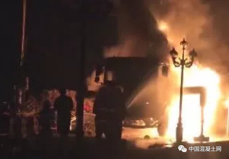 起火的ued网站泵车四个支撑柱张开,输送ued网站的曲臂也伸展开来,整个车身被熊熊的大火包围。泵车油箱破裂,大量的柴油外漏,现场卷起了5米多高的火舌。