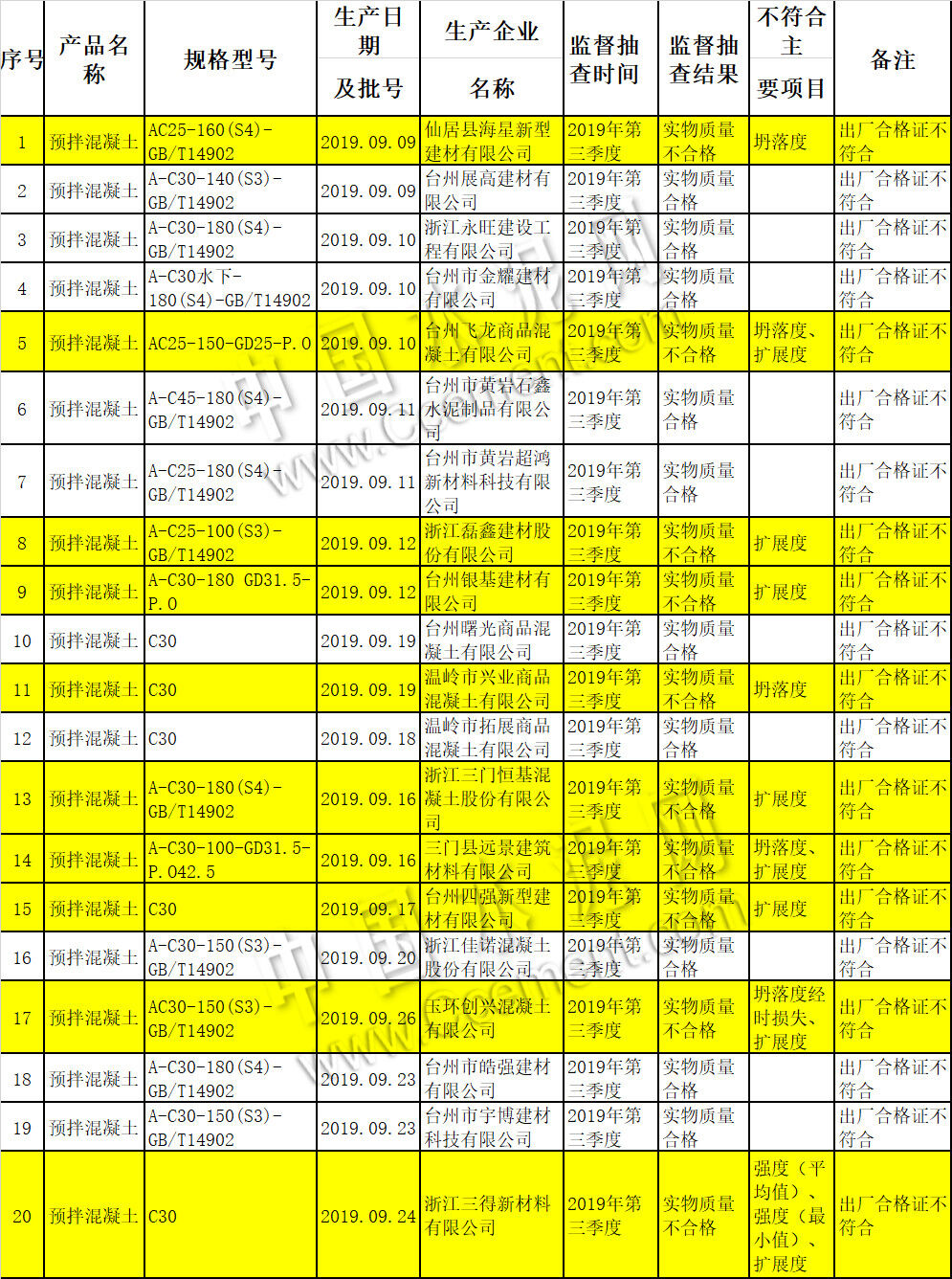 12月24日,台州市市场监督管理局官网发布2019年预拌ued网站产品质量专项监督抽查结果信息。近期,根据《中华人民共和国产品质量法》、《浙江省产品质量监督条例》的规定,台州市市场监督管理局组织开展了2019年台州市预拌ued网站产品质量专项监督抽查,涉及到台州市有20家企业的20批次产品,其中实物质量不合格10批次,实物质量不合格率为50%。主要不符合项目为:强度、坍落度、坍落度经时损失、扩展度。本次专项监督抽查发现合格证普遍存在不符合现象。