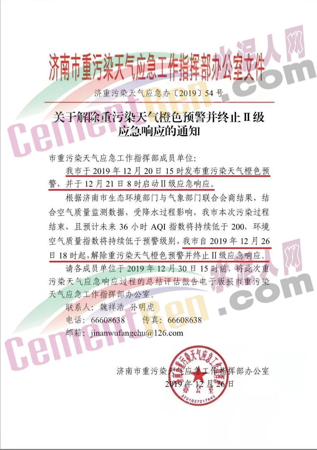同期,山东省济南市重污染天气应急工作指挥部办公室发布了《关于解除重污染天气橙色预警并终止II级应急响应的通知》称,自2019年12月26日18时起,解除重污染天气橙色预警并终止II级应急响应。通知原文如下: