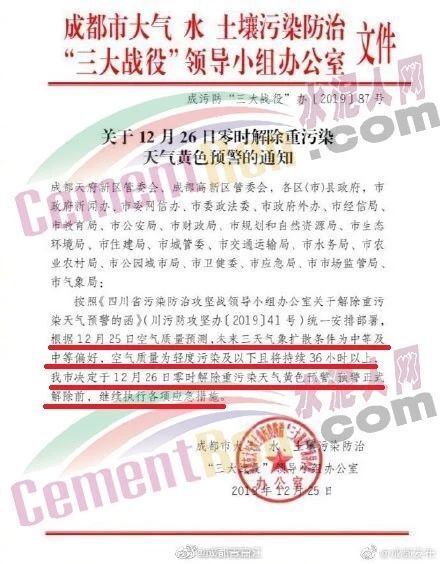 12月25日,四川省成都市大气水土壤污染防治三大战役领导小组办公室发布了《关于12月26日零时解除重污染天气黄色预警的通知》称,成都市定于12月26日零时解除重污染天气黄色预警,预警正式解除前,继续执行各项应急措施。通知原文如下: