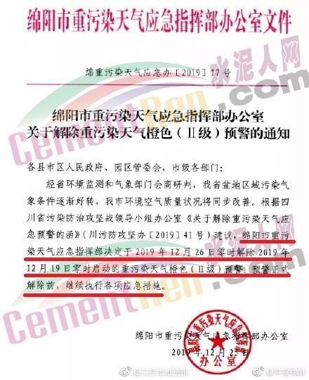 同期,四川省绵阳市重污染天气应急指挥部办公室发布了《关于解除重污染天气橙色(II级)预警的通知》称,绵阳市重污染天气应急指挥部定于2019年12月26日零时解除2019年12月19日零时启动的重污染天气橙色(II级)预警,预警正是解除前,继续执行各项应急措施。通知原文如下: