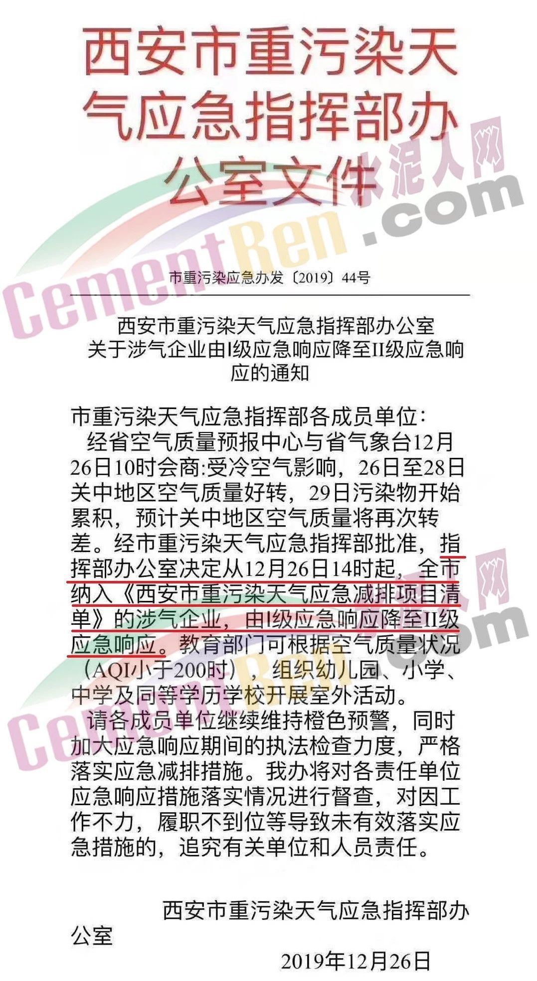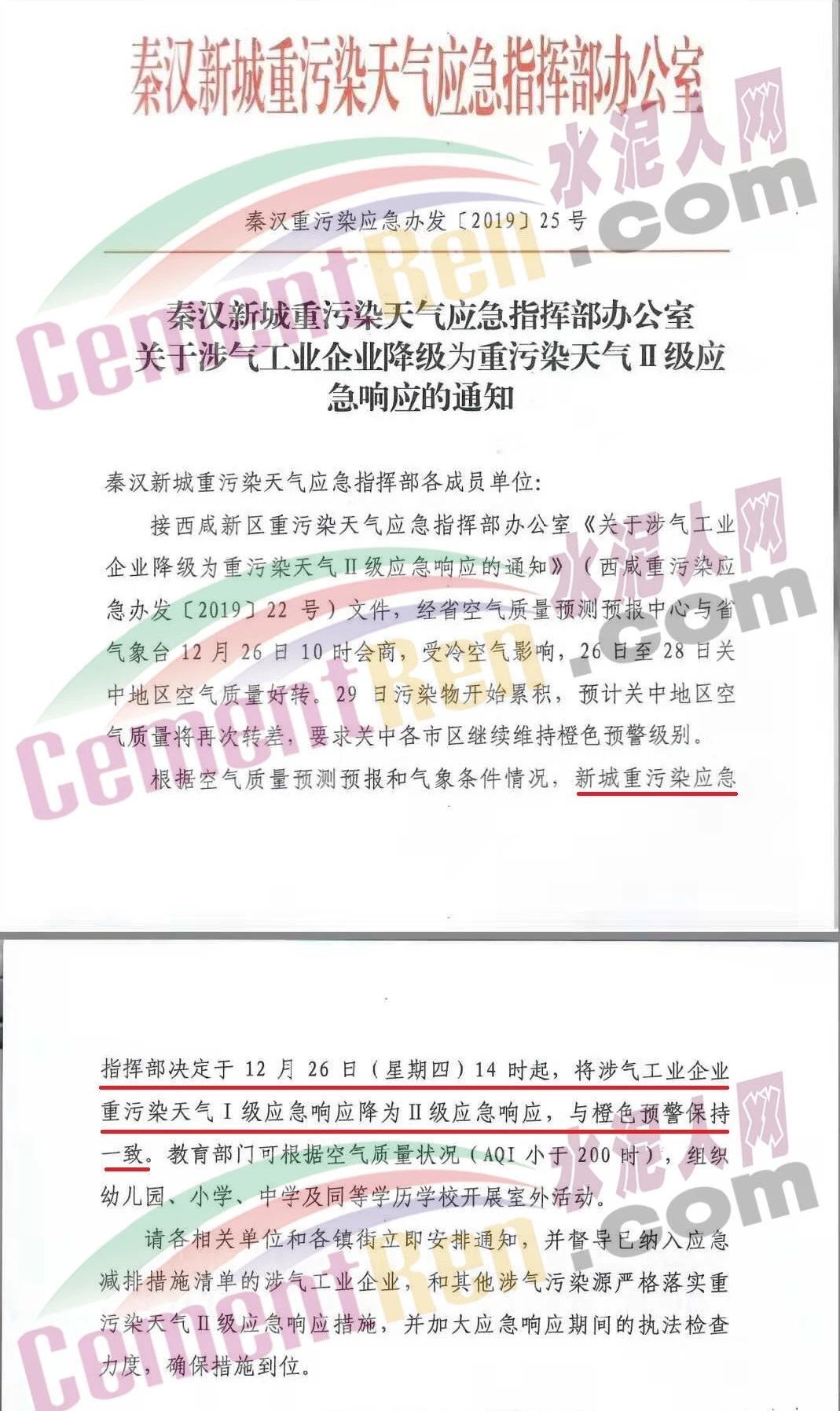 12月26日,陕西省西安市重污染天气应急指挥部办公室发布了《关于涉气企业由I级应急响应降至II级应急响应的通知》称,西安市指挥部办公室定于12月26日14时起,全西安市纳入《西安市重污染天气应急减排项目清单》的涉气企业,由I级应急响应降至II级应急响应。通知原文如下: