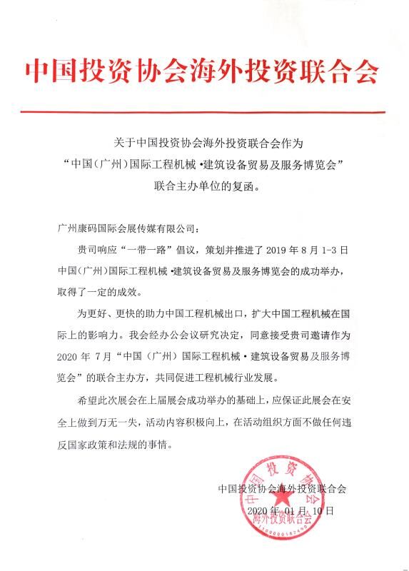 2019年开展的致力于促进“工程机械、建筑设备国际贸易与服务”的康马展的成功举行后,展会承办方康马网董事长刘智向中国投资协会海外投资联合会(简称海合会)刘雄英会长汇报展会工作,会长对展会发展给予了充分肯定的同时欣然接受康马申请,同意作为2020年康马展联合主办方,给康马展注入更多海外资源、开拓展会各方渠道,相信在海合会联合主办指导下,2020康马展将打造成具备国际影响力的工程建筑机械国际贸易标杆展会。