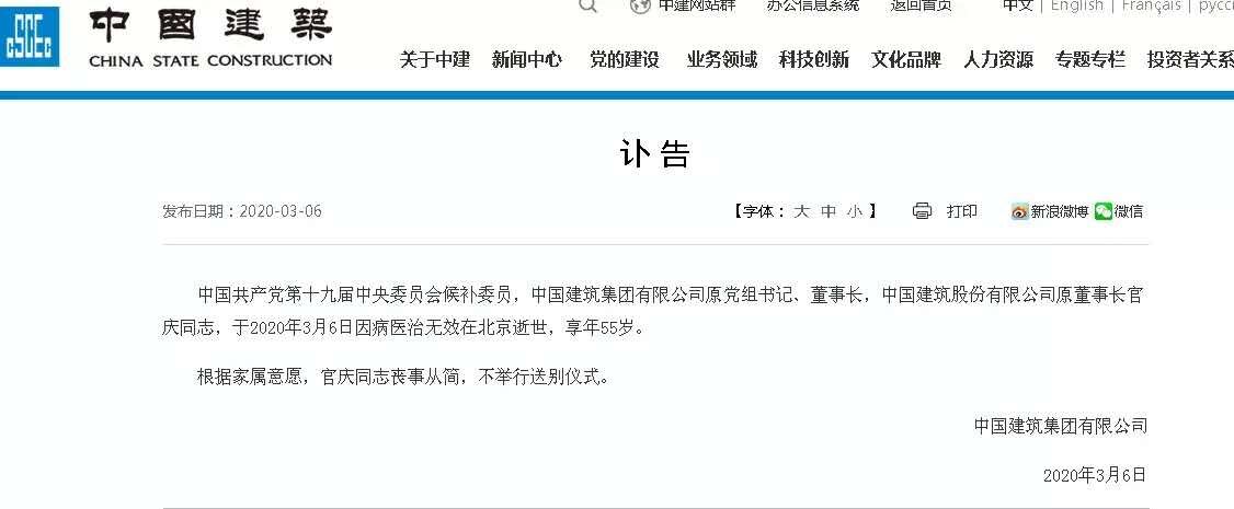 中国共产党第十九届中央委员会候补委员,中国建筑集团有限公司原党组书记、董事长,中国建筑股份有限公司原董事长官庆同志,于2020年3月6日因病医治无效在北京逝世,享年55岁。