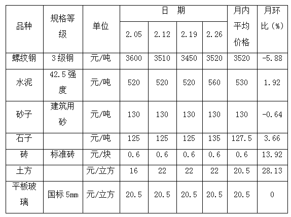 受春节假期和新冠肺炎疫情影响,2月份山东省济宁市黄河滩区迁建物资市场交易量明显减少,价格变动整体涨跌互现。与上月相比,7种黄河滩迁建物资价格呈4升2降1平态势。其中,螺纹钢的价格震荡下行,水泥的价格稳中有涨,砂子、砖和平板玻璃的价格月内平稳运行,石子的价格受季节性供应减少影响小幅上升,土方的价格呈现高位整理态势。螺纹钢方面,截止到2月26日,济宁市梁山县监测的螺纹钢市场批发价格为3520元/吨,价格下降明显。由于目前特殊时期,货运受阻且下游企业复工进度开展缓慢,短期内需求仍然偏弱,市场整体成交冷清,库存和资金压力逐步增加,供给压力放大,商家对于后市心态偏空,处于悲观情绪,市场整体处于有价无市状态。