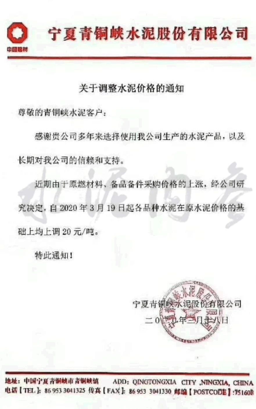 此前,宁夏赛马水泥有限公司发布通知,称由于近期原燃料、备品备件采购价格上涨,公司决定自3月16日起各品牌、各品种水泥在原有价格基础上上调20元/吨。