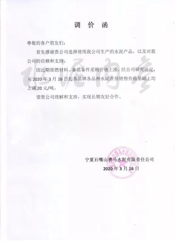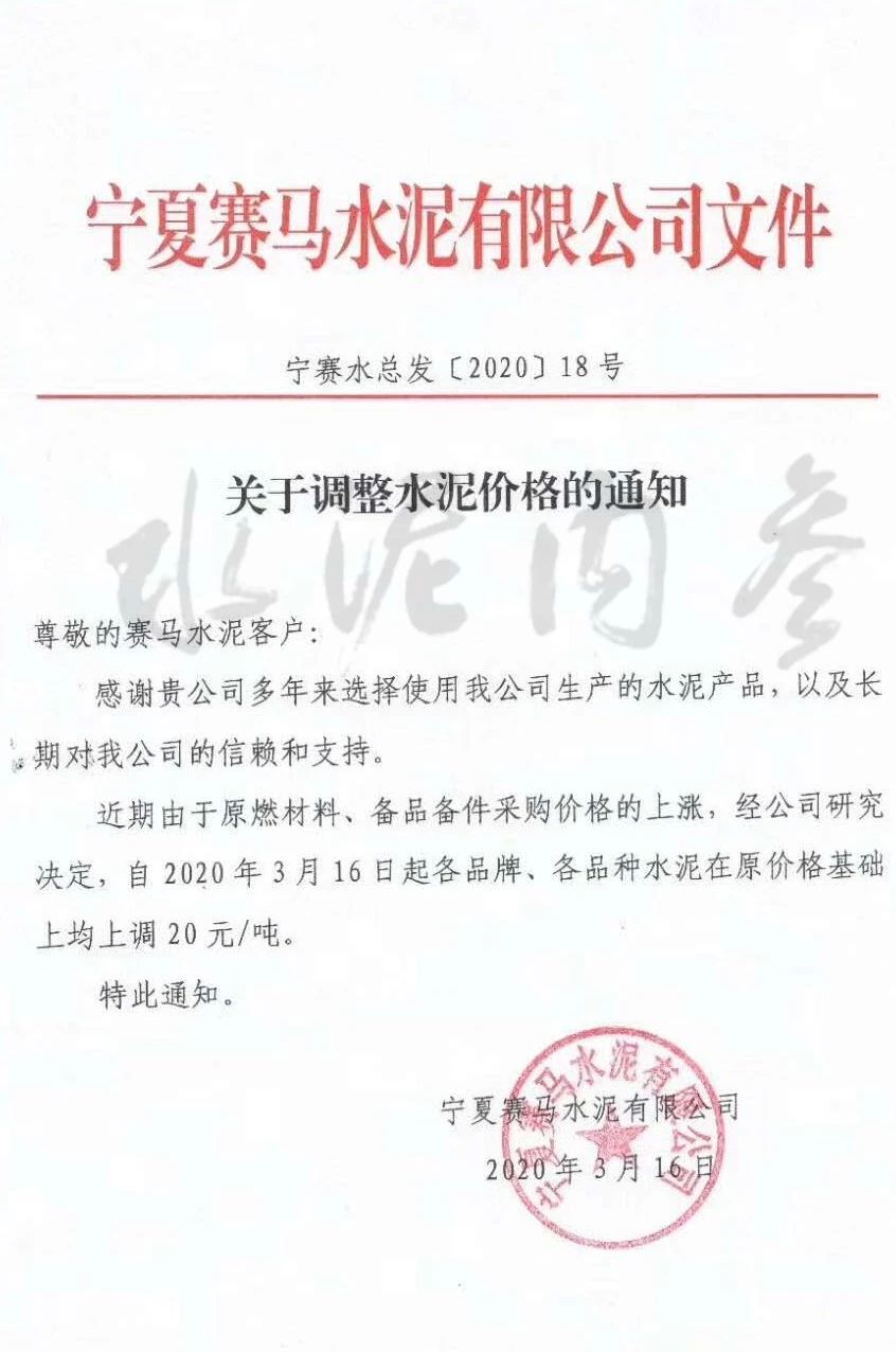 宁夏石嘴山赛马水泥有限公司发布通知,称由于近期原燃材料、备品备件采购价格上涨,公司决定自3月16日起各品牌、各品种水泥在原有价格基础上上调20元/吨。