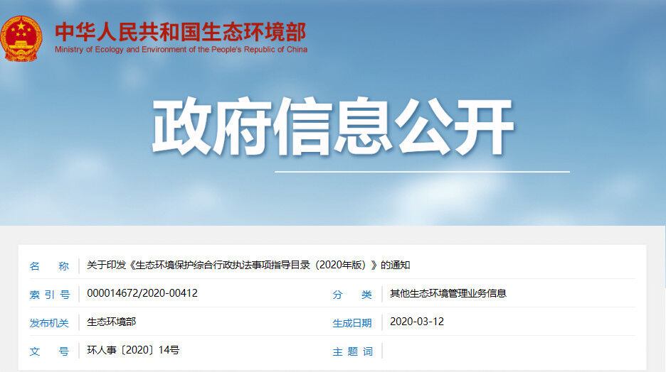 近日,生态环境部发布了关于印发《生态环境保护综合行政执法事项指导目录(2020年版)》(以下简称“《指导目录》”)的通知,称根据深化党和国家机构改革有关安排部署,为贯彻落实《国务院办公厅关于生态环境保护综合行政执法有关事项的通知》(国办函〔2020〕18号)要求,扎实推进生态环境保护综合行政执法改革,现印发《生态环境保护综合行政执法事项指导目录(2020年版)》及说明。