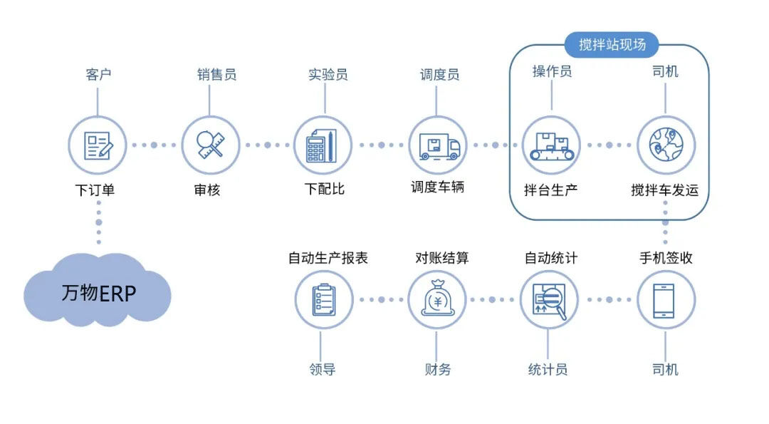 万物ERP依托工业互联网平台技术,将搅拌站大部分工作人员从搅拌站现场解放出来,在总部、在工地、在家中,不分白天黑夜,均能参与生产管理。