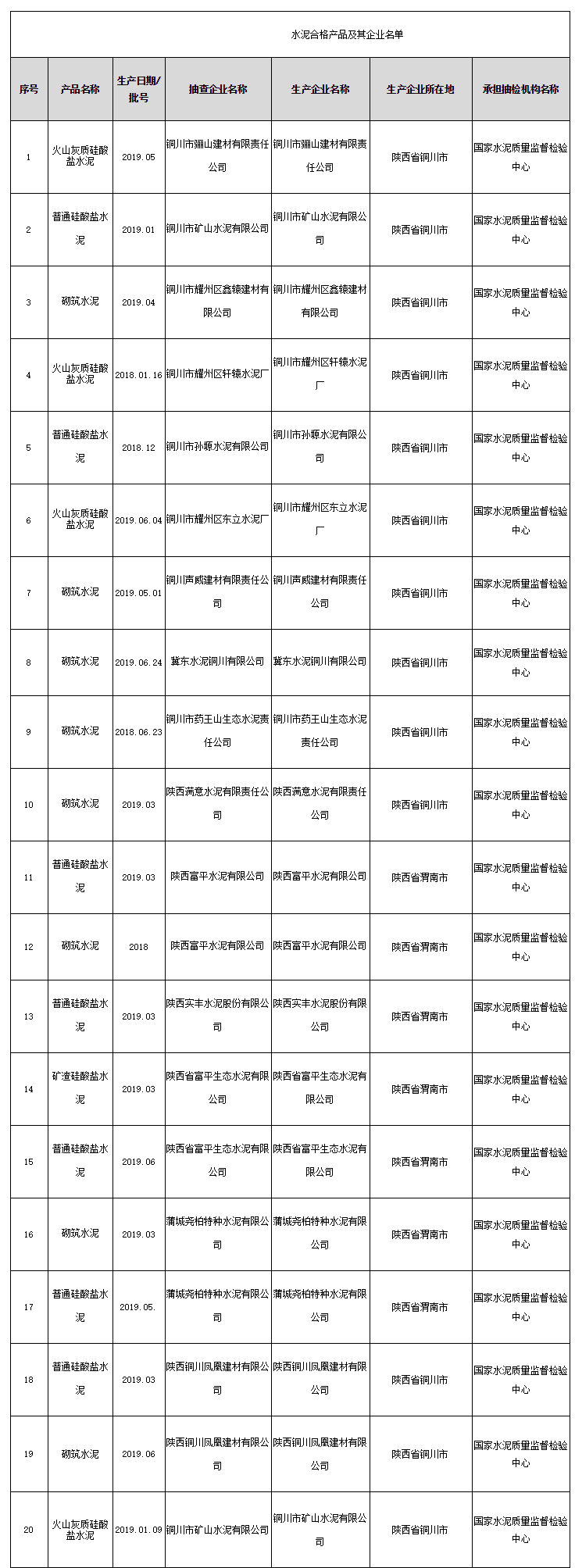 2020年3月31日,陕西省市场监督管理局网站公布水泥产品质量监督抽查结果。此次水泥产品在铜川、渭南等地的生产领域中抽取,共抽查生产企业15家,抽取样品20批次,经检验,合格样品20批次。