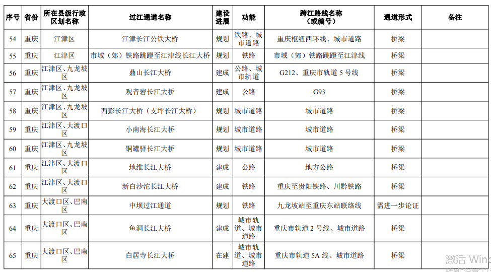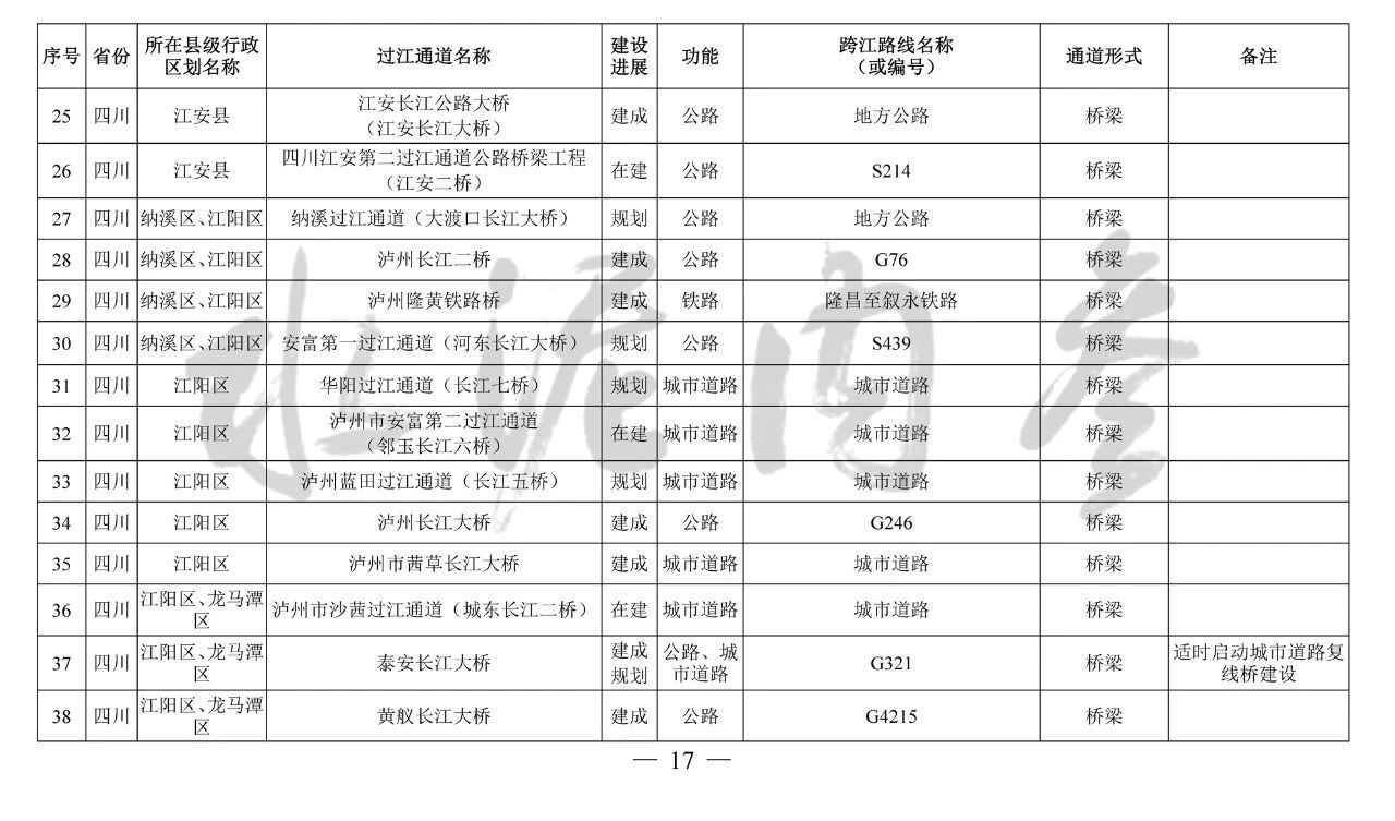 重庆市(17座):市域(郊)铁路跳蹬至江津线长江大桥、西彭长江大桥(支坪长江大桥)、小南海长江大桥、中坝过江通道、黄桷坪长江大桥、轨道27号线过江通道、重庆至黔江铁路过江通道、黄桷沱大桥、长寿长江三桥、涪陵石沱长江大桥、涪陵龙头港长江大桥、涪陵江北长江大桥、兴义长江大桥、西沱长江大桥、云阳复兴长江大桥、奉节二桥、巫山长江二桥