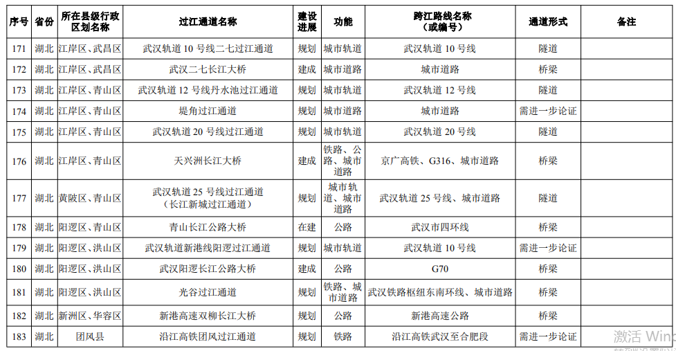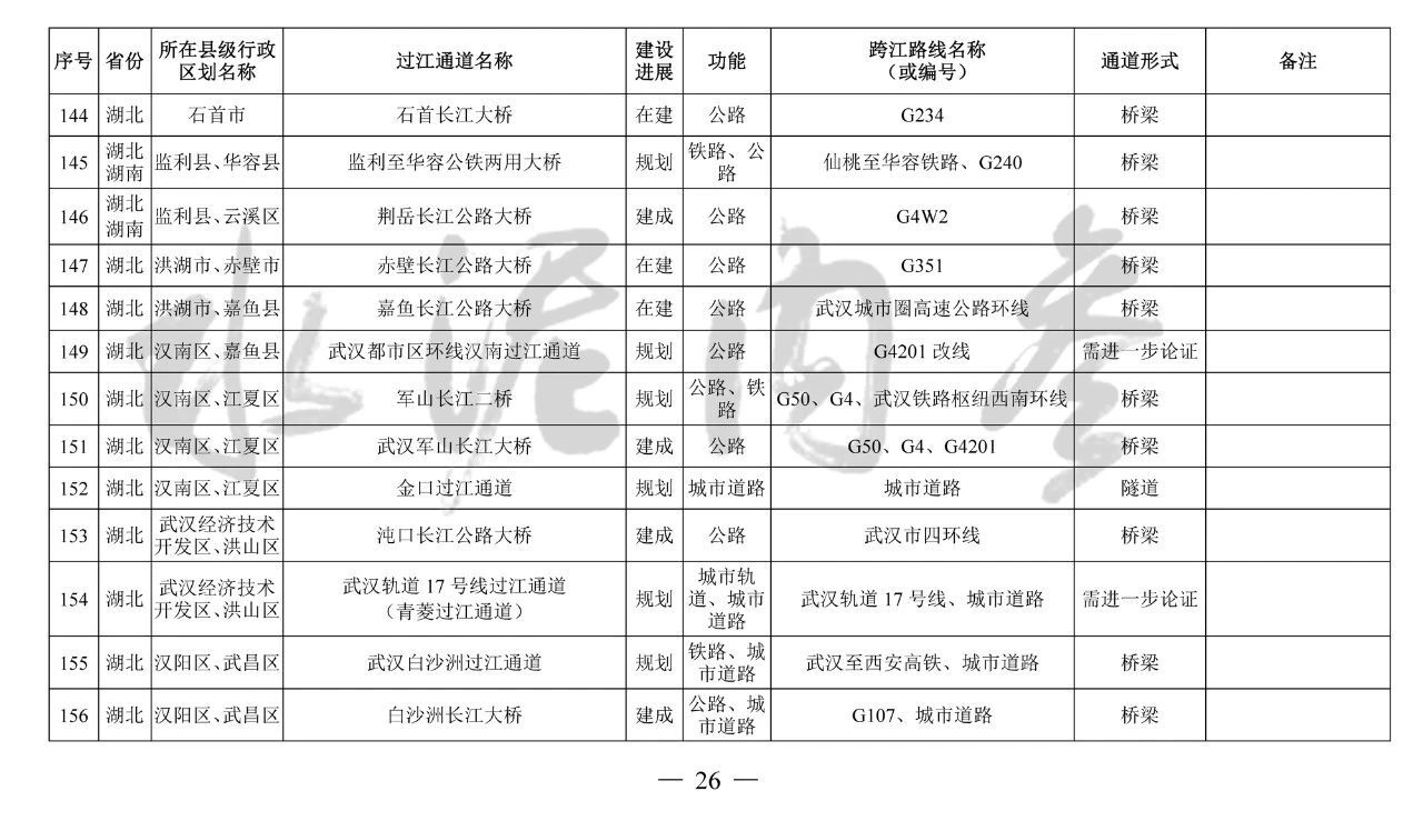 湖北省(24座):巴东长江公路二桥、兴山至长阳高速公路过江通道、宜昌东艳路过江通道、宜都红花套过江通道、枝江百里洲长江大桥、李埠长江公铁大桥、观音寺长江大桥、武汉都市区环线汉南过江通道、军山长江二桥、武汉轨道17号线过江通道(青菱过江通道)、武汉白沙洲过江通道、武汉轨道12号线白沙洲过江通道、武汉轨道11号线三期汉阳段过江通道、武汉轨道13号线过江通道(小东门过江通道)、二七路过江通道、武汉轨道10号线二七过江通道、武汉轨道12号线丹水池过江通道、堤角过江通道、武汉轨道20号线过江通道、武汉轨道25号线过江通道(长江新城过江通道)、武汉轨道新港线阳逻过江通道、光谷过江通道、新港高速双柳长江大桥、鄂黄第二过江通道鄂湘界(1座):监利至华容公铁两用大桥
