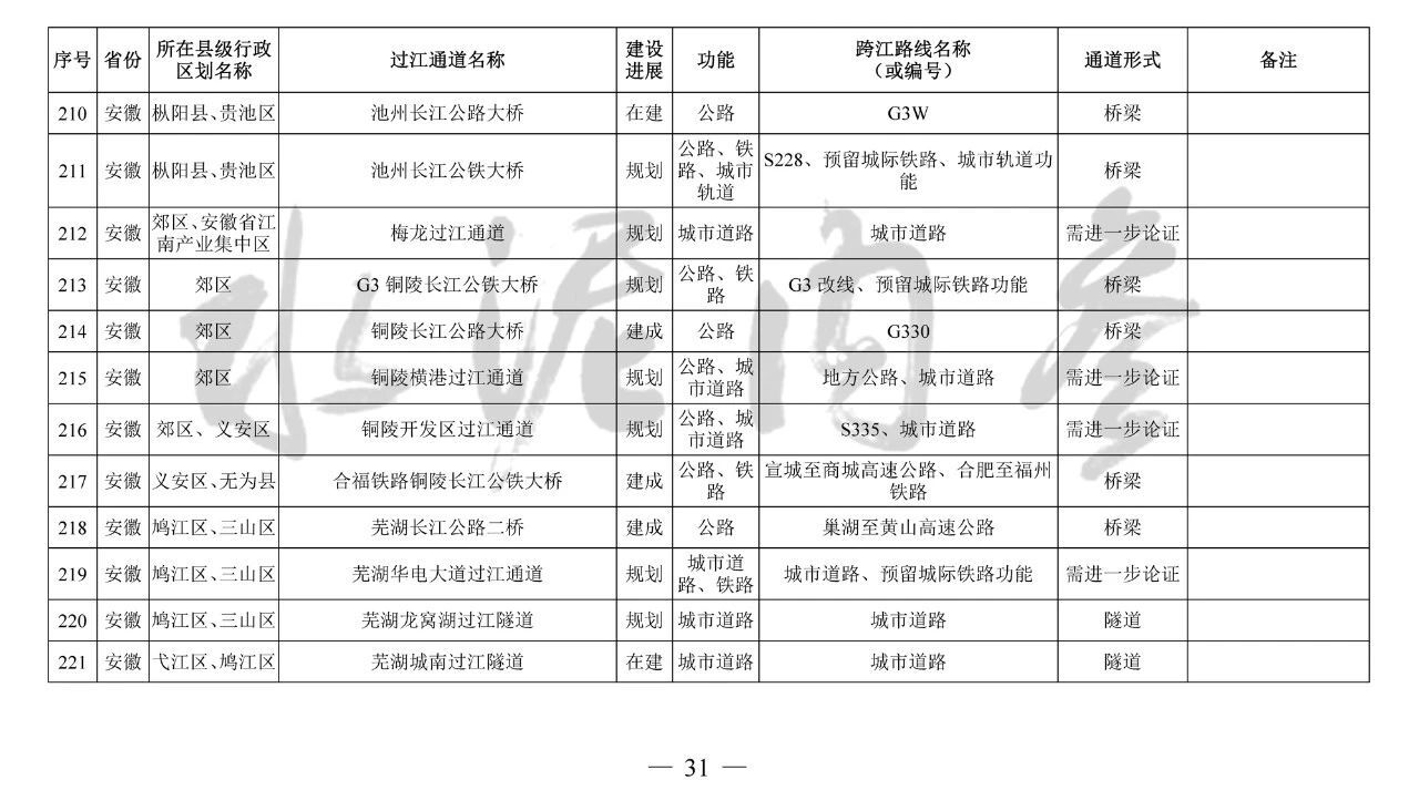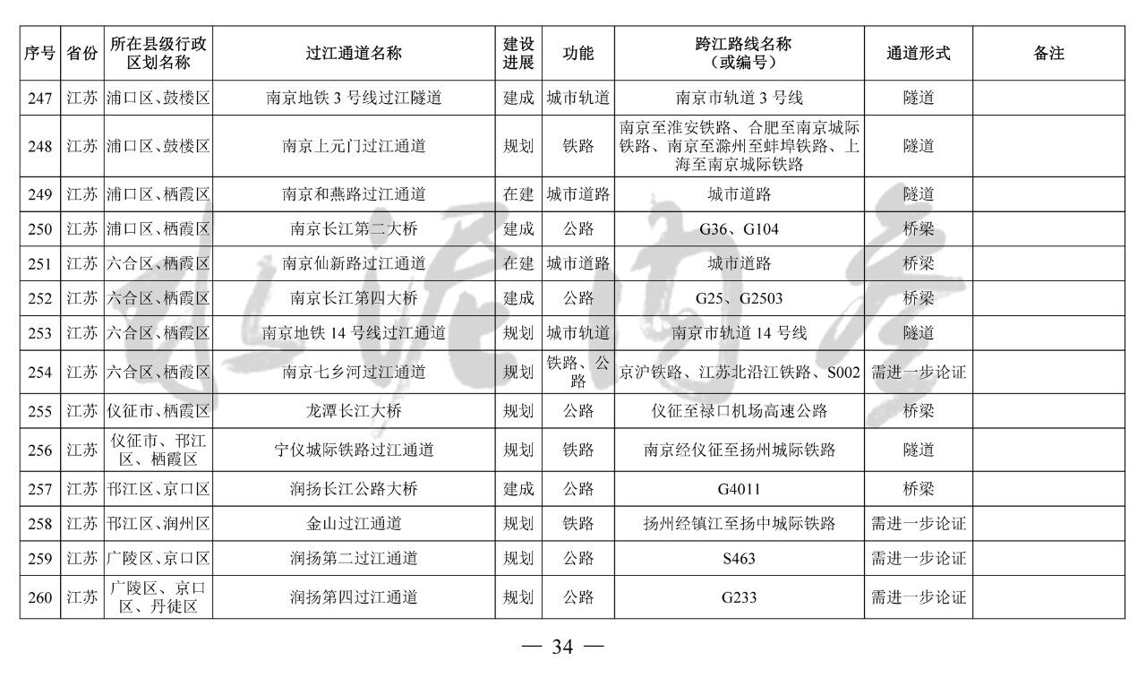 江苏省(13座):锦文路过江通道、南京地铁4号线过江通道、南京市域快速轨道过江通道、南京上元门过江通道、南京七乡河过江通道、龙潭长江大桥、宁仪城际铁路过江通道、润扬第二过江通道、江阴第二过江通道、江阴第三过江通道、张皋过江通道、苏通第二过江通道、海太过江通道