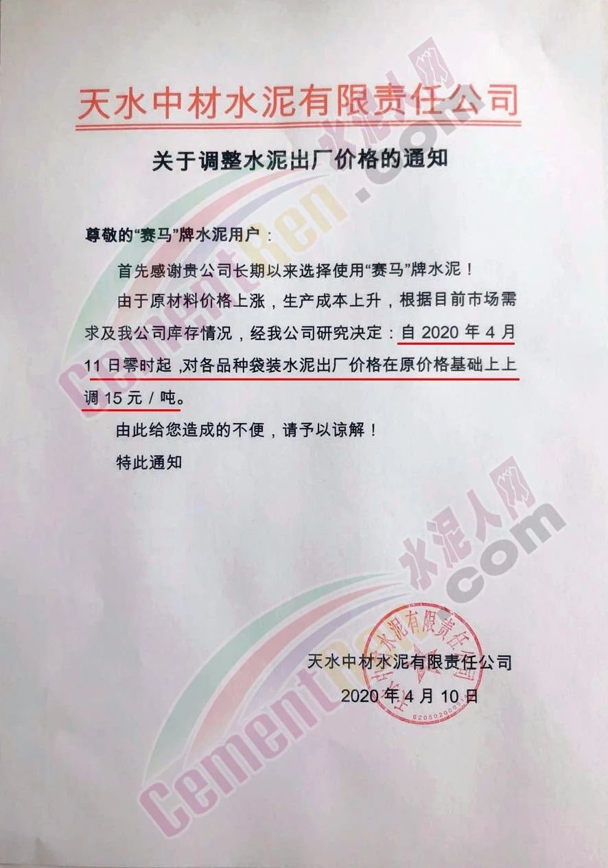 昨日(4月10日)天水中材水泥有限责任公司通知,由于原材料价格上涨,生产成本上升,根据目前市场需求公及公司库存情况 ,经公司研究决定自今日(4月11日)零时起,对各品种袋装水泥出厂价格在原价格基础上上调15元/吨。